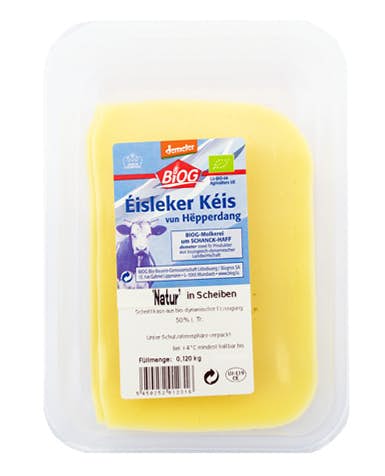 The basic product in the Éisleker Kéis cheese (in portions, sliced, or cubed) is the fresh Demeter quality milk produced at Schanck-Haff in Hupperdange. In the BIOG farm cheese dairy at Schanck-Haff, this milk is inoculated with cheese cultures, in a traditional manner, refined with herbs and spices, then traditionally processed into cheese. Lastly, the ripe cheese is picked up by the organic wholesaler BIOGROS and transported to the warehouse in Munsbach. The cheese is cut and packed in the BIOGROS Cuisine Artisanale then delivered to the retailers, where it can be bought by the consumers.
